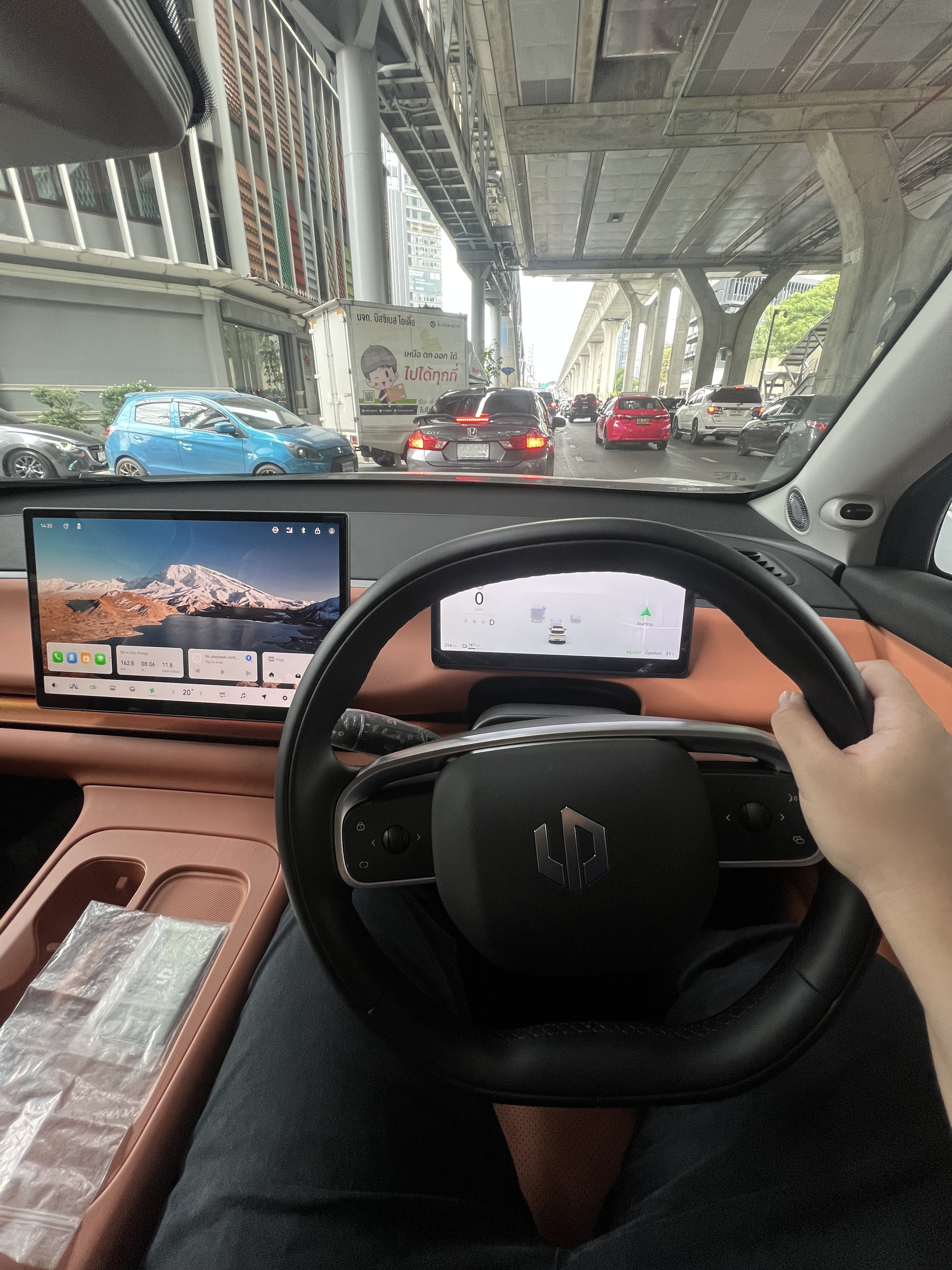 พอถึงเวลาลองขับ ผมลองปลดล็อครถดู ปรากฎว่า เสียงเปิดปิดประตูแนวรถ Benz แถมกุญแจที่ใช้นั้น เป็น Keycard อย่างเดียว ไม่ได้มีตัวกุญแจรีโมทอะไรเลย เมื่อได้ขับรถ เห็นได้ว่า ทัศนวิสัย Leapmotor C10 นั้น กลับมองเห็นได้ง่ายกว่า Deepal S07 ที่ผมได้ลองขับ กระจกบานหน้าก็มองเห็นฝากระโปรงหน้าที่นูนๆ ช่วยกะระยะด้านหน้าได้ง่ายมาก ช่วงล่างของ C10 นั้น แม้จะเป็นสปริงและช่วงล่างทำร่วมกับ Maserati แต่ขับแล้ว ให้ความรู้สึกเหมือนขับรถที่เป็นช่วงล่างถุงลม พวงมาลัยนั้น พอหมุนแล้วก็ไม่ได้หนักไป และก็ไม่ได้เบาไป หมุนได้ Smooth กำลังดี หลังจากที่ได้ลองขับมาแล้ว ส่วนตัว ผมว่าพอใจกับรุ่นนี้มากๆ เสียอย่างเดียว ไม่มี Head Up Display แบบ Deepal S07 แต่อย่างน้อยก็มีมาตรวัดดิจิตอลที่ C10 มี (แต่ Deepal S07 คู่แข่ง Leap C10 ไม่มี)