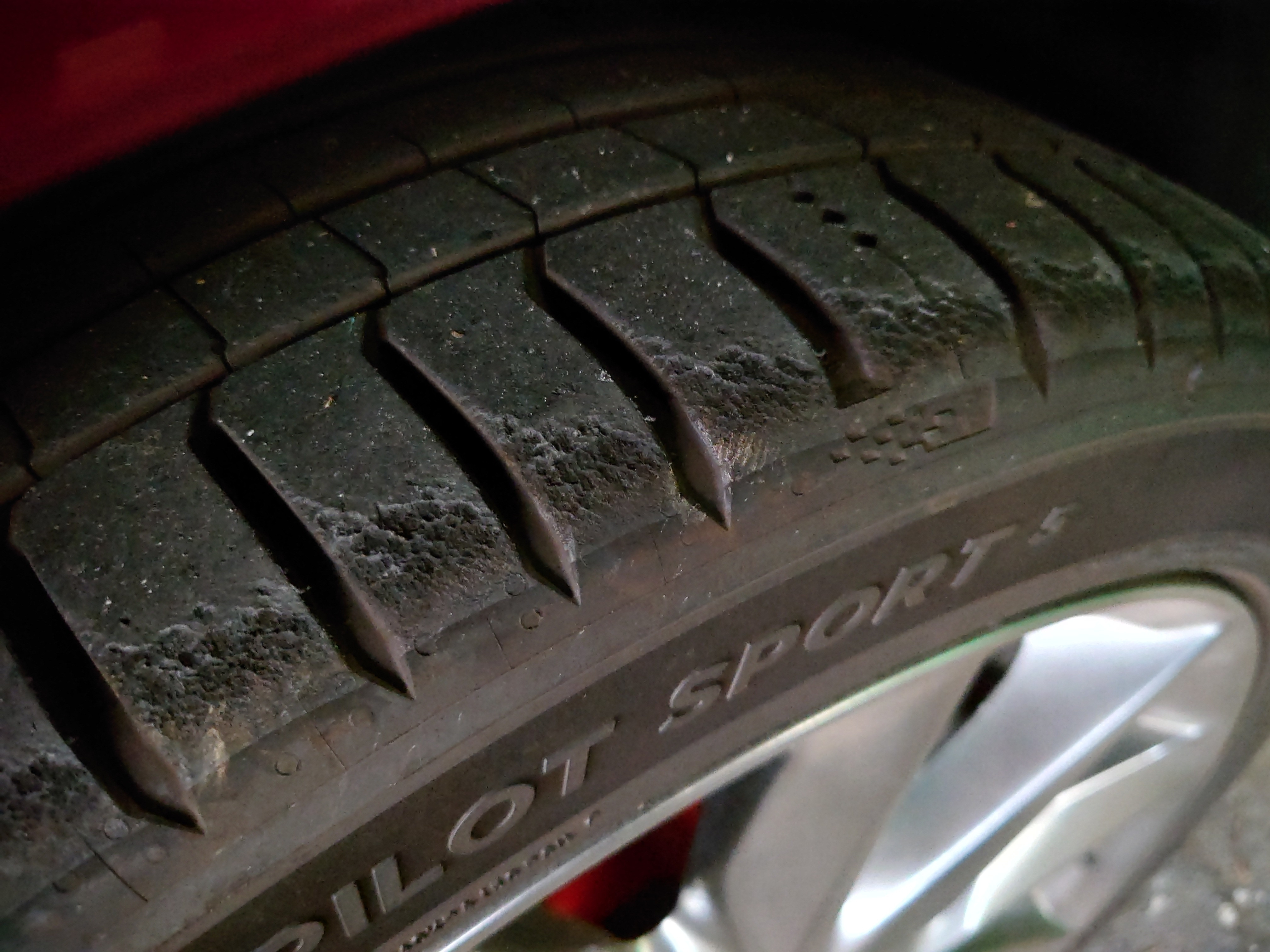 สภาพยางหลังจากจบ session 20 นาทีแรก ยางโดน curb กินเป็นรอยช่วงขอบๆ กับหน้ายางละลายไปพอสมควร